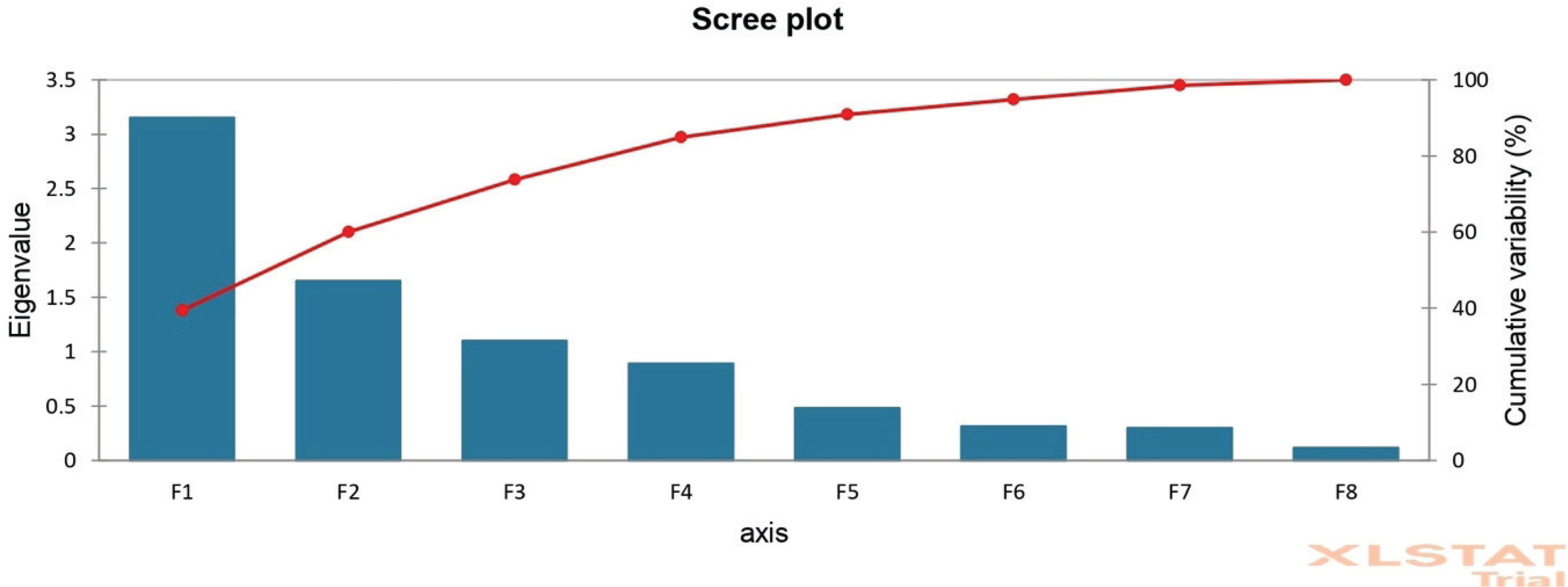 Scree plot of eigenvalue and cumulative variability (%) for the determinants of ethical values of health workers in three government hospitals in Palu City, a cross-sectional study, Indonesia, 2023 (N=30)