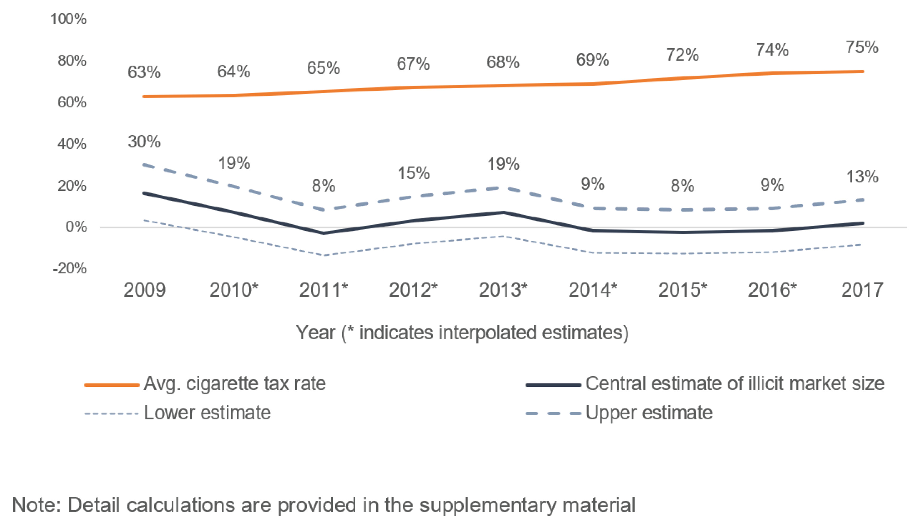 The trend of the average tax rate and illicit market size is given in Figure 2. Between 2009 and 2017, the average tax rate saw a steady increase from 63% to 75%. In contrast, the estimated illicit market size does not exhibit a significant increase. Our most conservative estimates show that compared to 2009 (31% illicit market share), the size of the illicit market had declined nearly 14 percentage points by 2017. In 2011, the illicit share decreased to 10% which then increased to 20% in 2013. Then, for the next three years, it decreased and remained at around 10%. The most recent years have seen a slight increase from 10% to 14% in 2017. Significant rise of illicit cigarettes as a response to tax increase is not evident from our findings (see Supplementary file for detailed results).