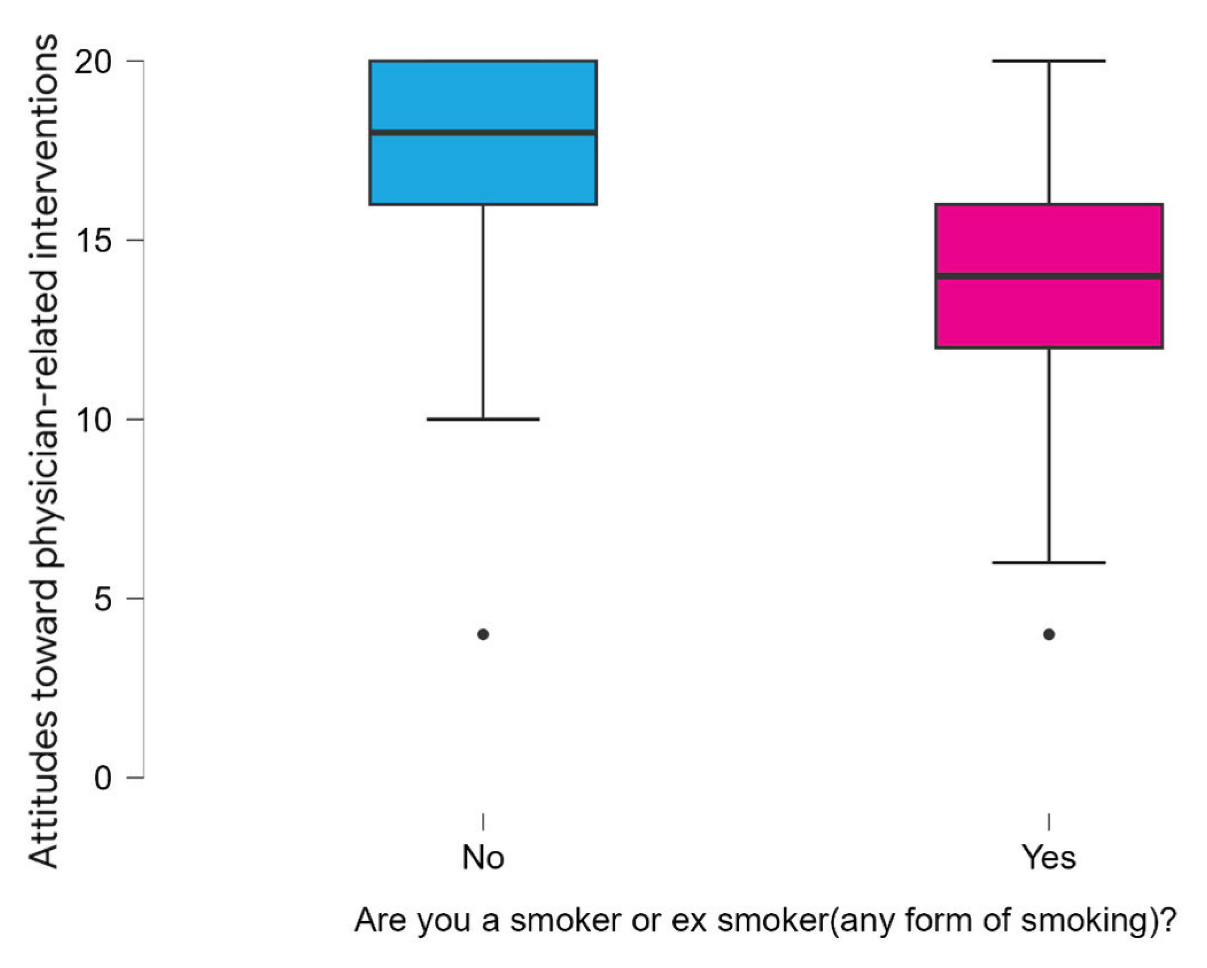 Interestingly, due to low factor loadings, only 4 out of 6 items were retained for the scale. EFA analysis supported retaining 1 factor via scree plot, and Table 4 shows items loadings on this factor, all of which are above 0.6. In addition, the cumulative variance explained by this factor was 50%, which is acceptable. CFA also supported retaining these four items with an overall KMO of 0.77 and a significant Bartlett’s chi-squared p-value (p<0.001). Also, model fit indices were acceptable (CFI=0.99, TLI=0.98, RMSEA=0.067, SRMR=0.019), confirming model fitness. Reliability analysis using MacDonald’s Omega (ω) revealed acceptable reliability for this factor (ω=0.80). Factor 1 was attitudes toward physician-related public health interventions for reducing smoking. The median value for this scale was 17 (IQR=15–19), and there was no significant difference in total score based on sex (p=0.163).